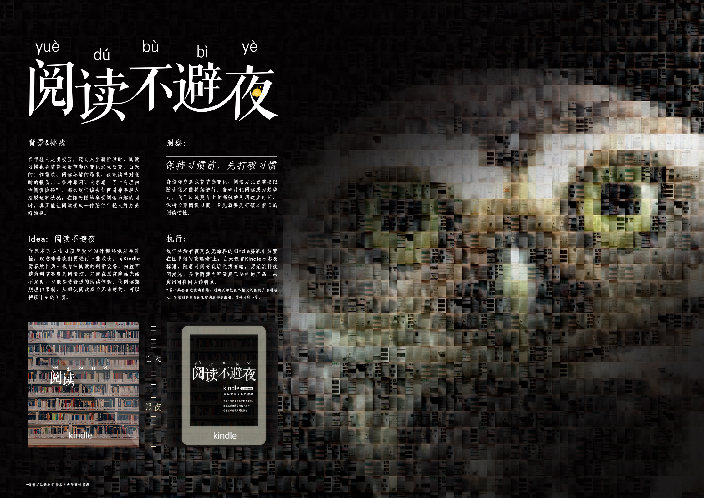 阅读不避夜 980 2960 0 广告 户外 创意 分享 当原本的阅读习惯与变化的外部环境发生冲撞,就意味着我们要进行一些改变。而Kindle青春版作为一款专注阅读的创新设备,内置可随意调节亮度的阅读灯。即便在黑夜降临光线不足时,也能享受舒适的阅读体验。使阅读摆脱理由限制,从而使阅读成为无束缚的、可以持续下去的习惯。我们将带有特殊夜间涂料的Kindle屏幕框放置在图书馆的玻璃墙上,Kindle屏幕将会根据早、晚时间(光线)的变化调整成不同的观看亮度,通过差别化的屏幕显示,向观看者呈现舒适的观看效果。 赞一下 南北手脑 ‹ › 发布