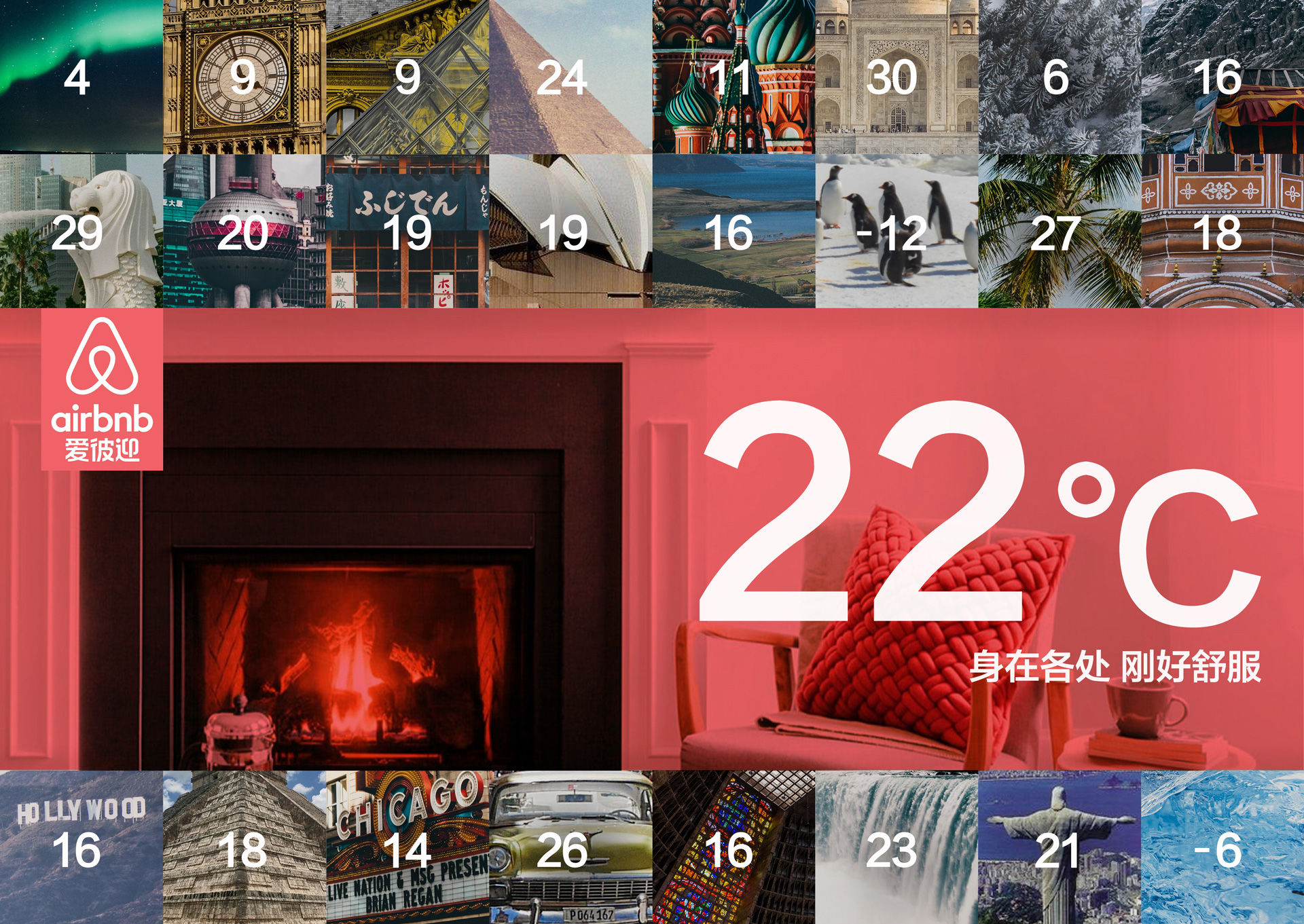 全世界的爱彼迎,永远 22 °c 267 2299 0 平面 分享 将世界各地的变化气温与爱彼迎的恒温进行对比 22度是让人感觉到最舒适的环境温度 突出旅行带给人的舒适性 重新定义旅行,从感受“舒服”开始 赞一下 南北手脑 ‹ › 发布